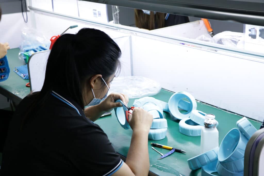 Quality control inspector manually trimming flash and inspecting details on custom blue silicone products at an assembly line, demonstrating the importance of rigorous post-production processing and visual inspection to avoid defects in silicone manufacturing.
