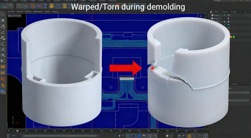 3D CAD simulation showing a silicone part comparison between a perfect design and a warped/torn product caused by poor mold release angles or shrinkage, illustrating common design mistakes in custom silicone engineering.