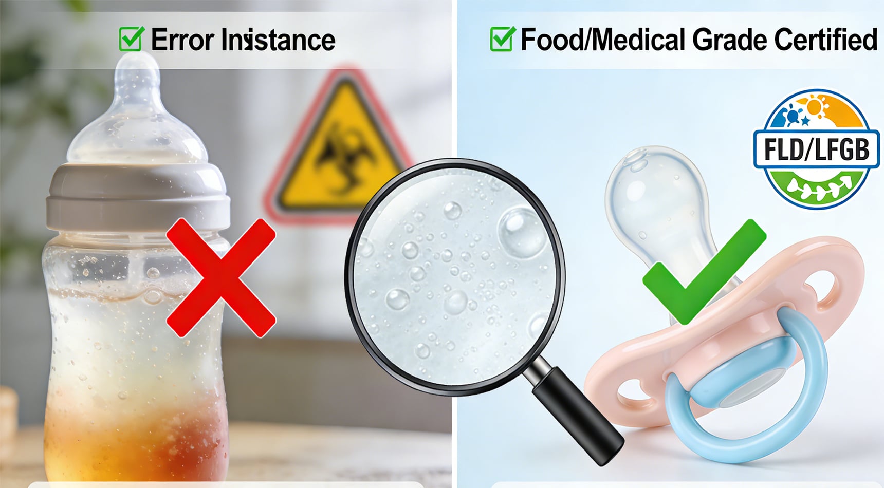 Comparison infographic showing the danger of using non-food grade silicone (left) versus the safety of FDA and LFGB certified medical grade silicone products (right), emphasizing the critical importance of material selection and compliance in baby and kitchenware applications.