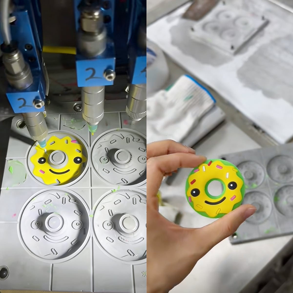 The glue dispenser is used to point the color of the liquid silica gel to the corresponding position of the mold, bake it and then put it into the solid silica gel for molding.