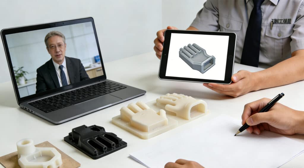 International team reviewing custom silicone product designs via video conference, using 3D models, technical drawings, and prototypes to clarify specifications and ensure accurate mold development in OEM ODM projects.
